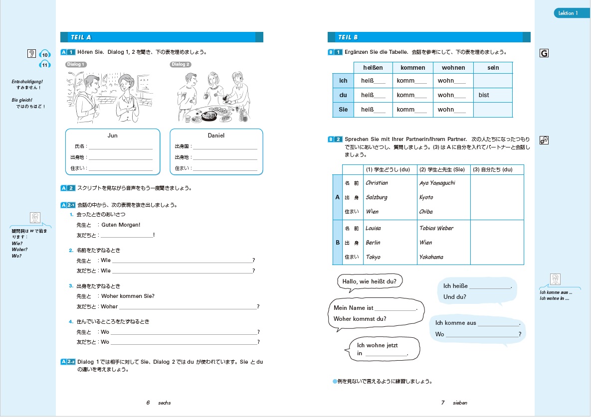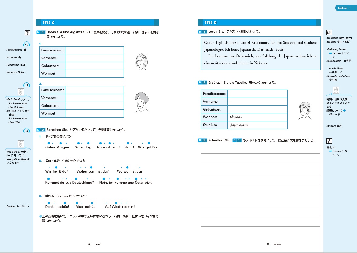 ◆ 教授用資料には、録音の全スクリプト、TEIL Aのみを抜粋した配布用スクリプトを収録している他、発音編として各課の学習項目に関する対話練習を兼ねた発音練習を設けています。
