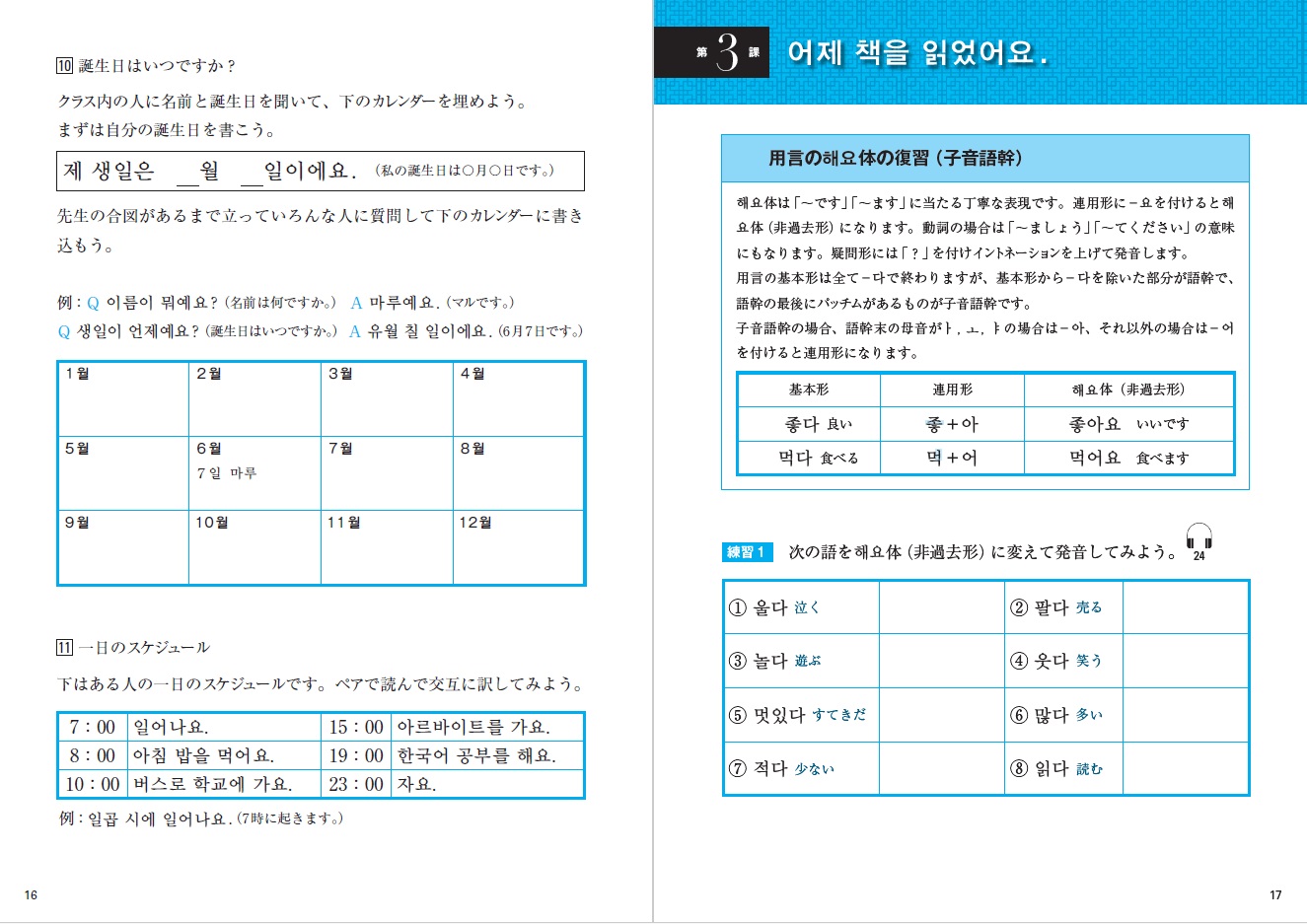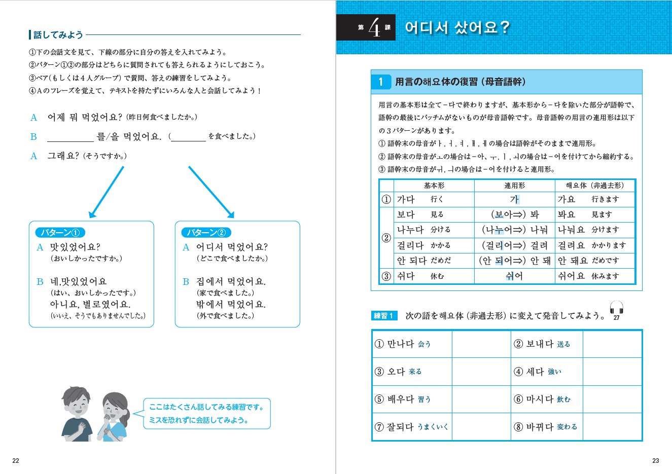 3課から20課までは、文法項目を各2つずつ提示しています。毎回多くの文法を学ぶのではなく、2 つの文法をしっかり理解し、使えるよう練習することに集中します。これらの文法項目についてまず基礎的な「練習問題」を解き、次に「会話」で実際の使われ方を学びます。最後の「話してみよう」では、その課の学習項目である文法の入った短い会話を複数の相手と練習することで、体験として文法をインプットします。その他、「話してみよう」では韓国語のことわざ、早口言葉、擬声語などをペアで学ぶ内容も設けています。