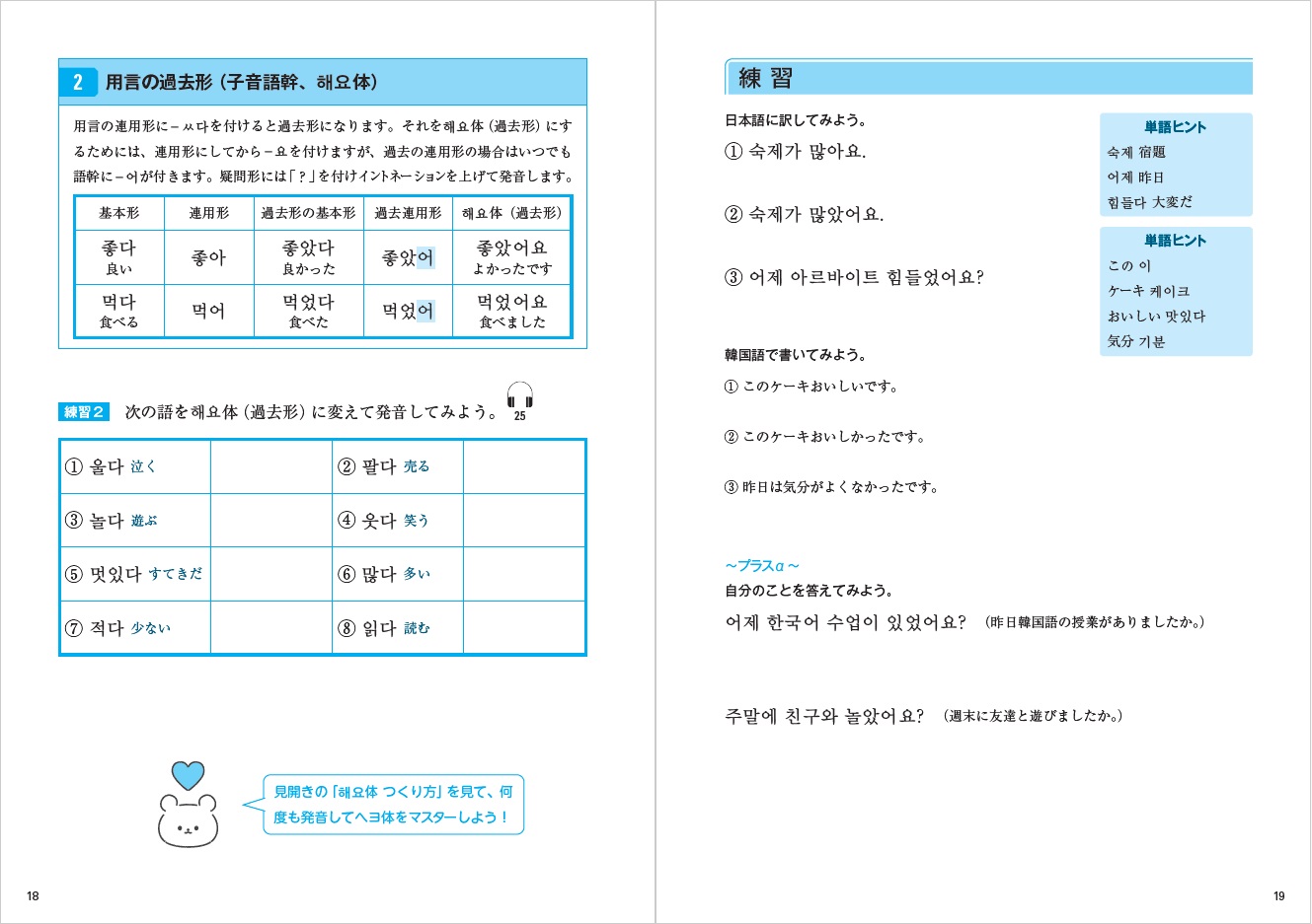 また、本書は何度も声に出し練習することで文法の習得を目指すため、実際に会話で使用されることの多いへヨ体については、本書冒頭にへヨ体の作り方が一目でわかる活用表を載せたほか、付録にも、本書で学ぶへヨ体を中心にへヨ体の一覧を掲載しています。